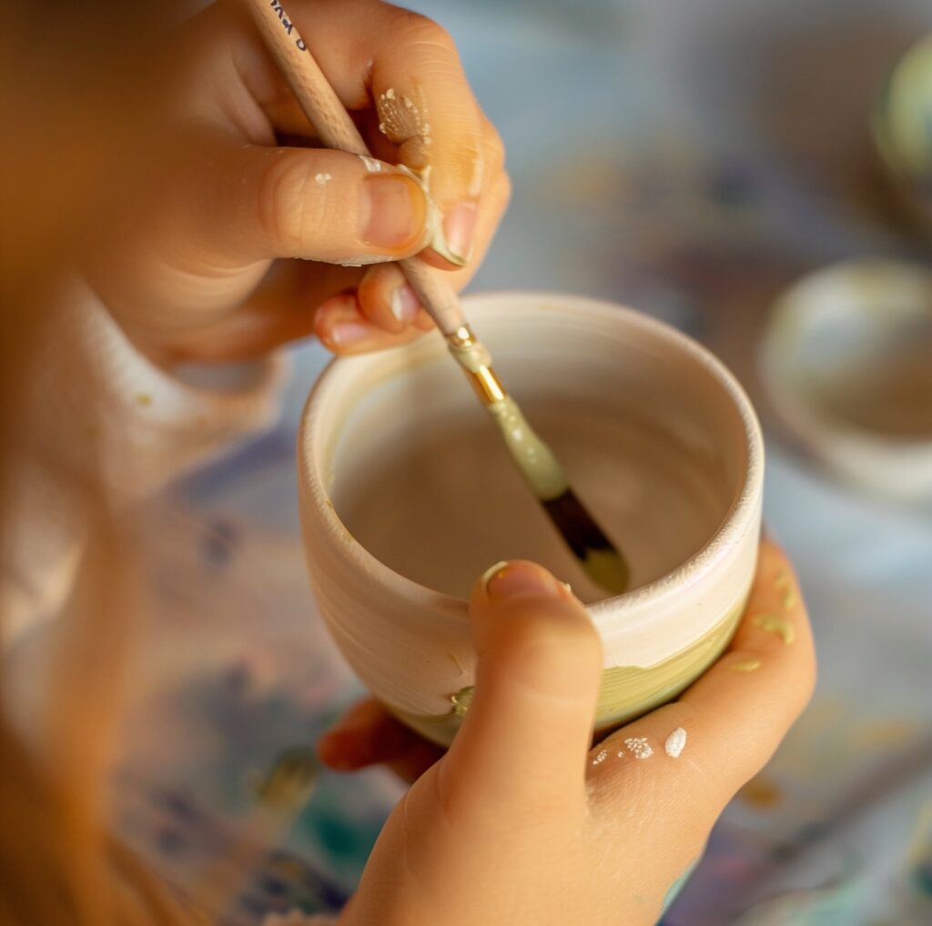 Aquí eliges una pieza de cerámica, la pintas a tu ritmo y nosotros la esmaltamos y horneamos para que puedas recogerla terminada días después.